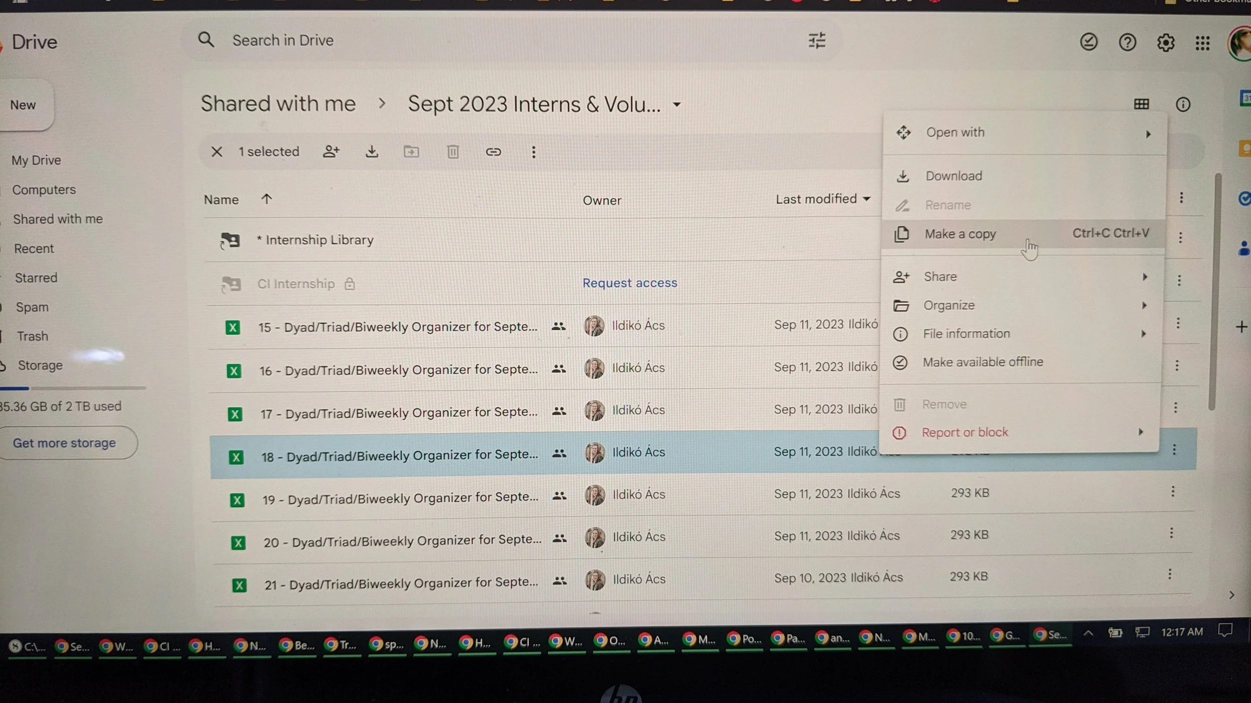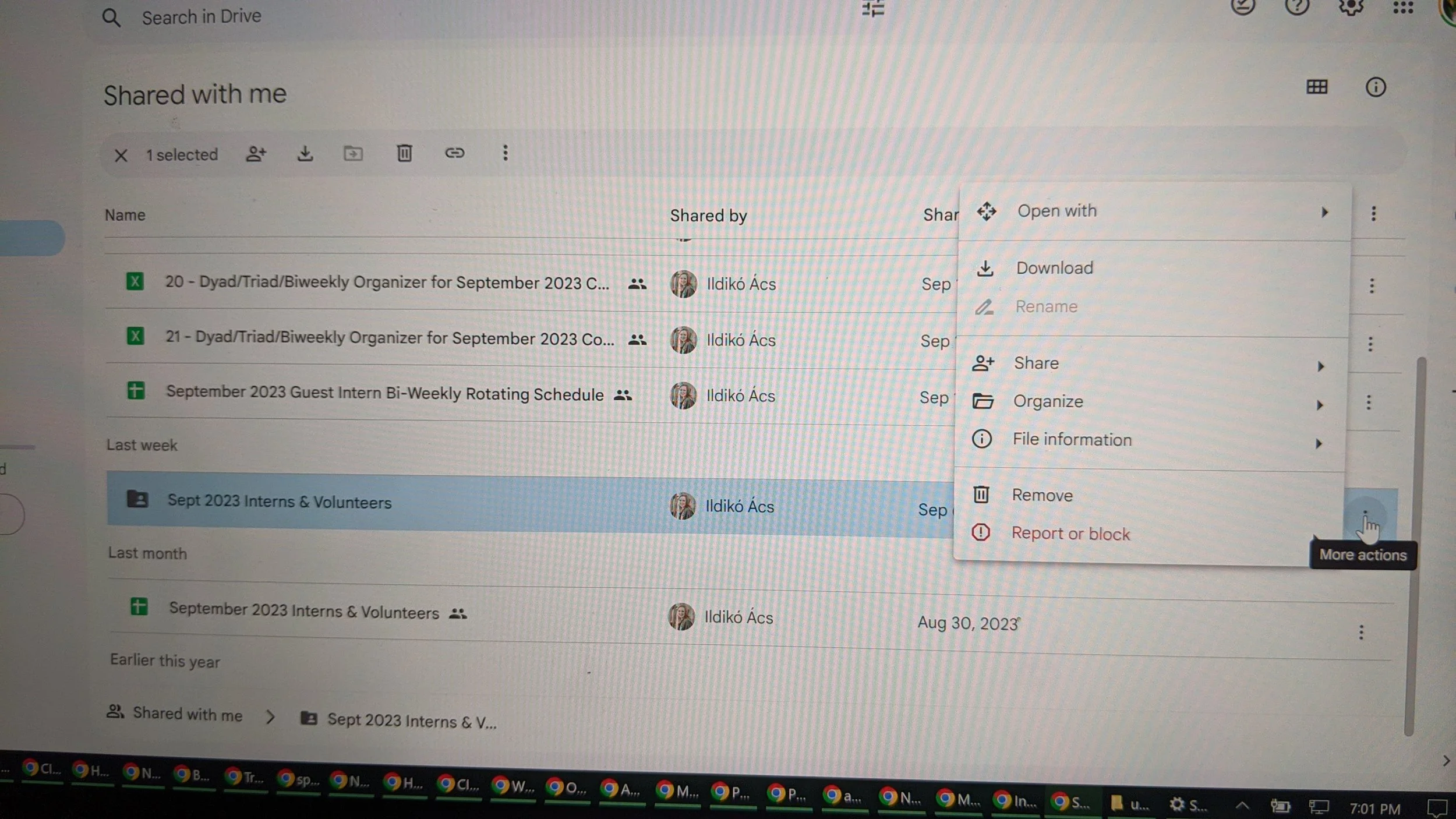 If you’re not already, go back to "My Drive", scroll down to 'S', and click on the three dots to the right, or right-click on the "Sept 2023 Interns & Volunteers" folder.