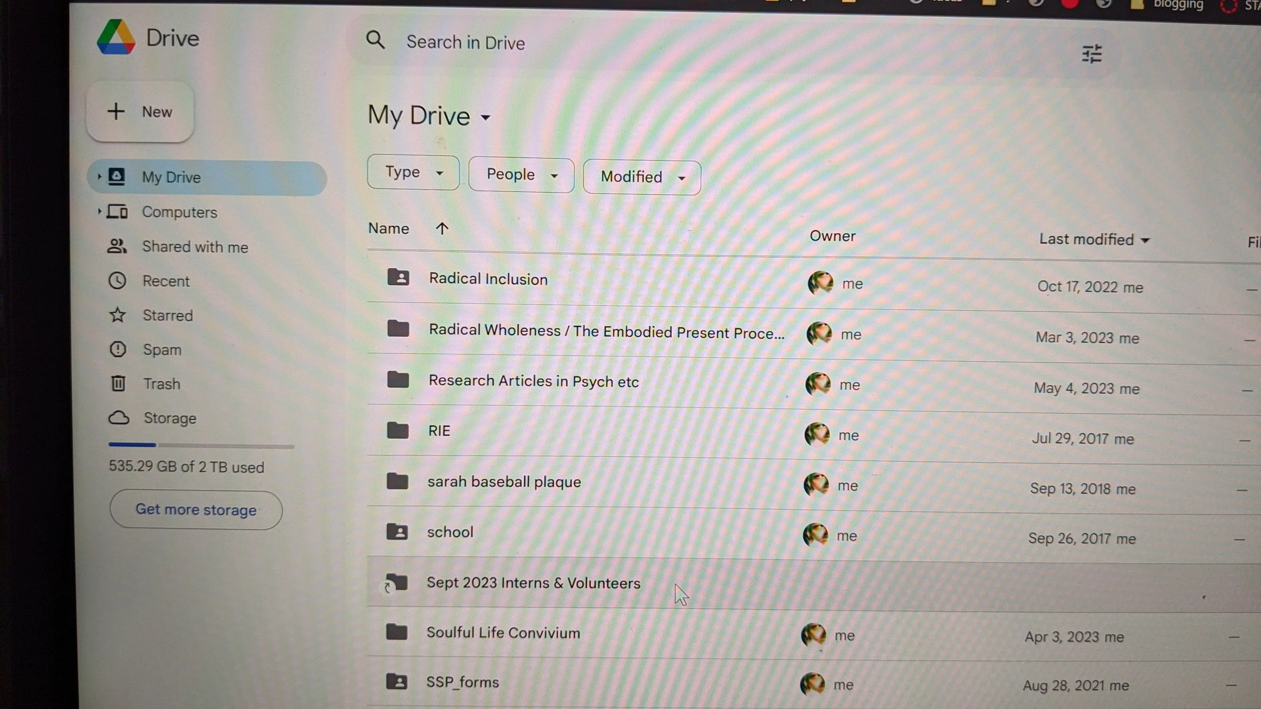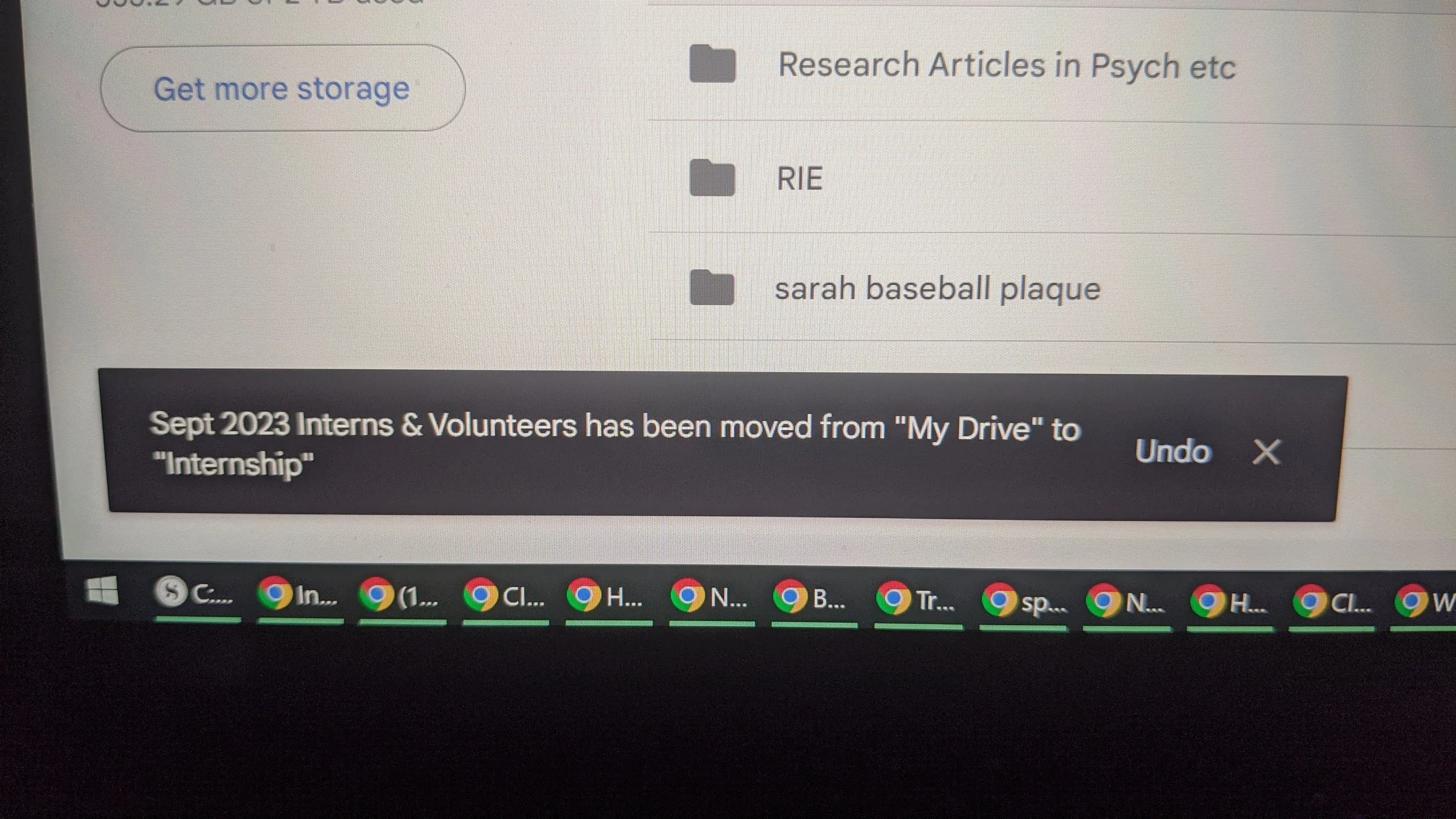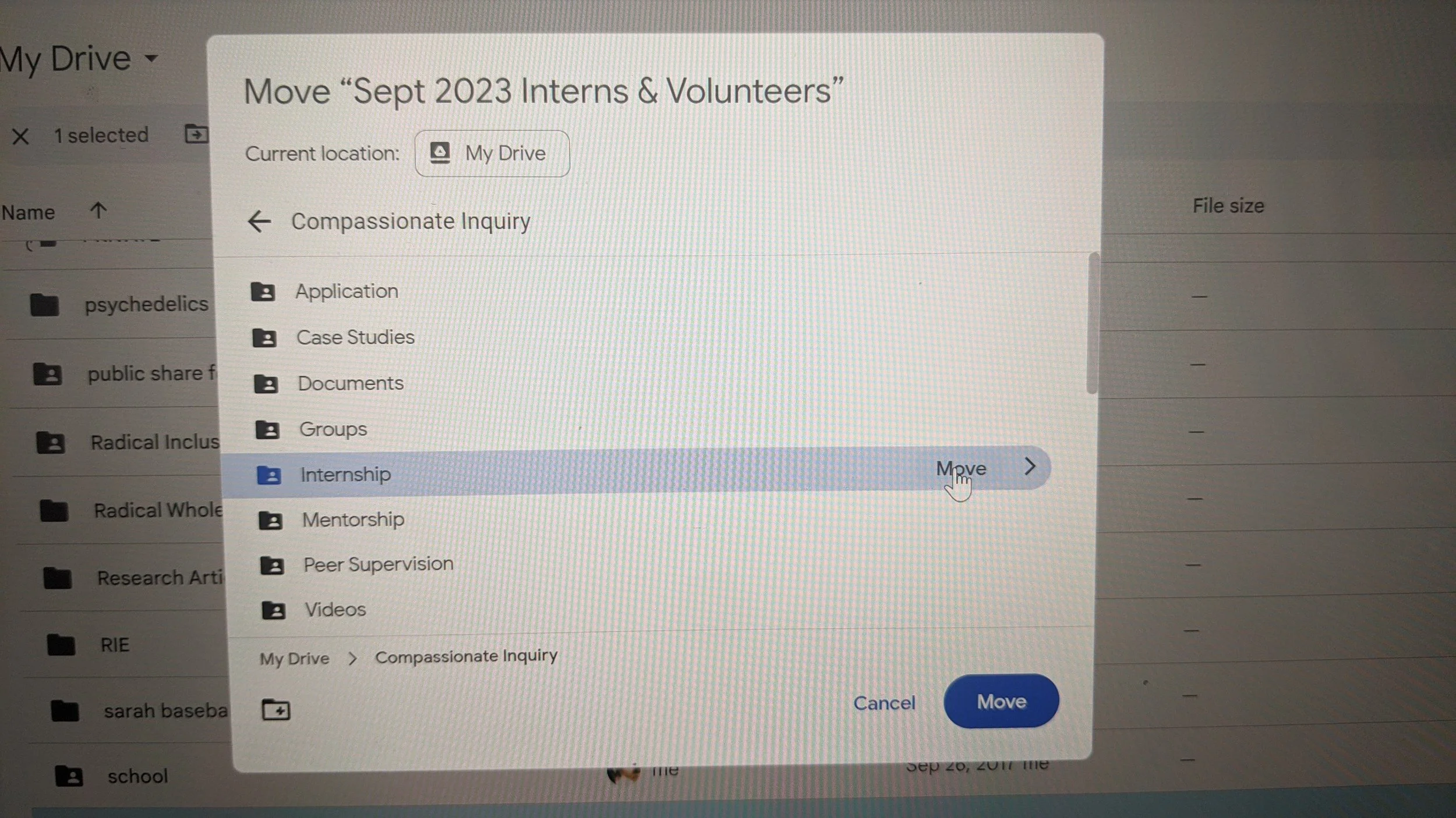 In my case, for instance, I have a "Compassionate Inquiry" folder in my root Drive directory where I already store all my CI-related stuff, so I created an "Internship" folder there where I’d like to access all things related to the internship, rather than trying to remember that the internship stuff is in a folder name that starts with 'S'. You can create whatever file structure suits you and move the folder there…