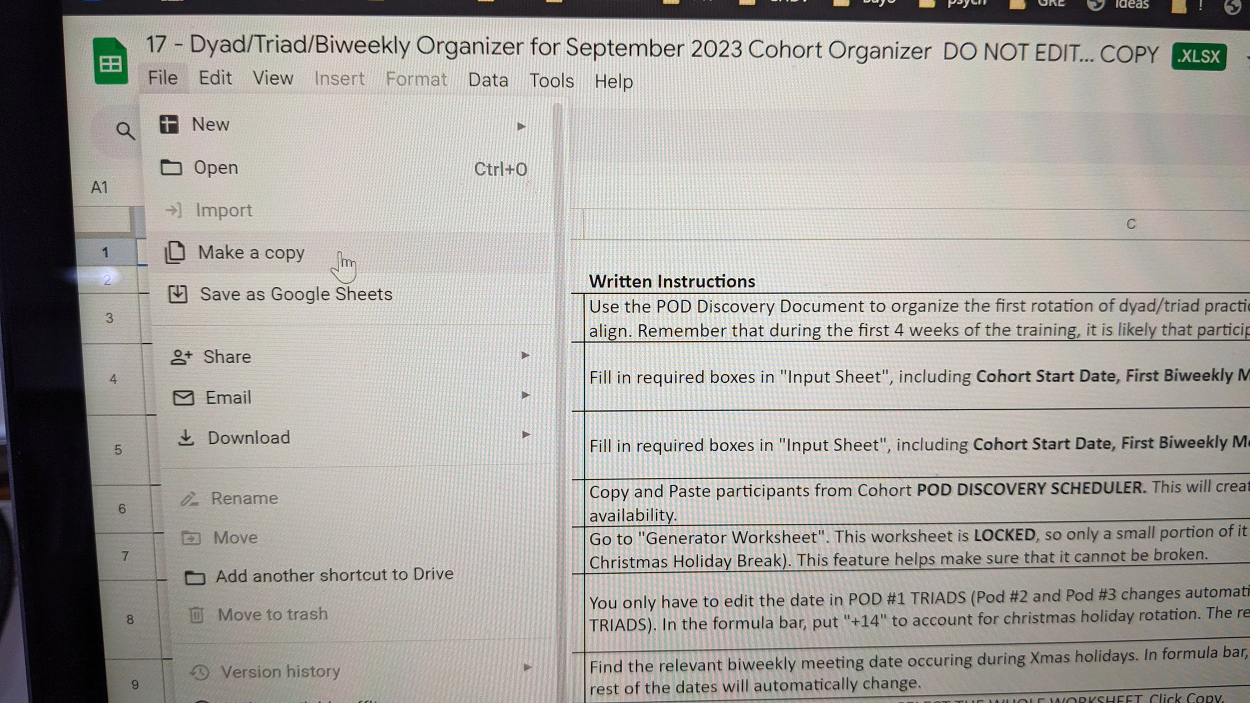 The first way is to click on the three dots at the end of the line (or right-click) for the file you want to copy, and select "Make a copy". This way is less ideal, but I will show you how it works so you know both of your options and how they work, because maybe you’d like to know the ins and outs of Google Drive better.